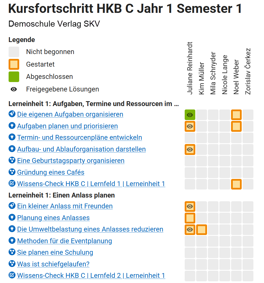 Als Kursleitung können Sie in der Übersicht Kursfortschritt den Lernfortschritt aller Kursteilnehmenden anschauen sowie die abgegebenen Aufgaben einsehen.