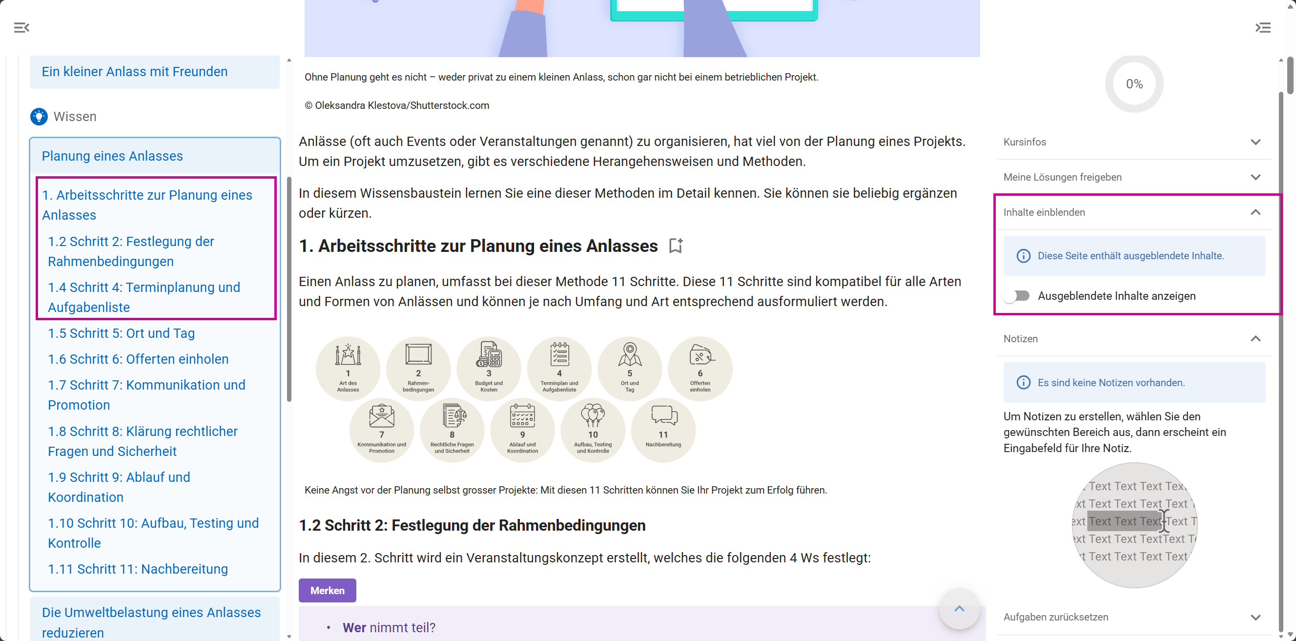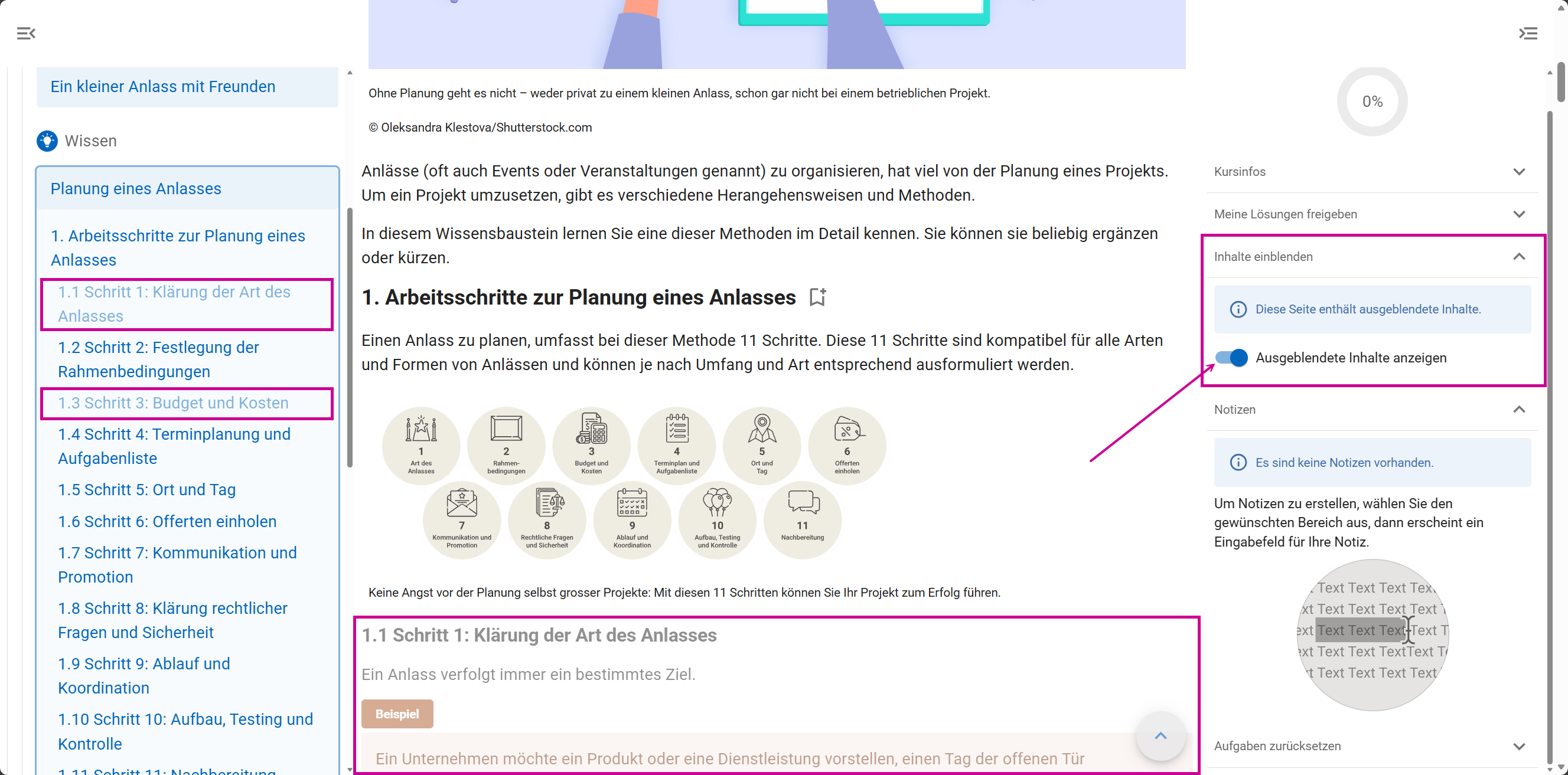 In folgendem Kurs hat die Lehrperson die Abschnitte «1.1 Schritt 1: Klärung der Art des Anlasses» und «1.3 Schritt 3: Budget und Kosten» ausgeblendet. Er wird der lernenden Person links in der Navigation und im Inhalt zunächst nicht angezeigt.